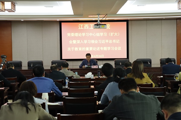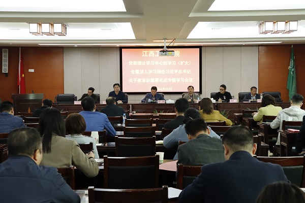 (本网讯 何凯 报道)4月26日下午,我校召开党委理论学习中心组(扩大)学习会,专题学习习近平总书记关于教育的重要论述。党委书记、督导专员胡涌主持会议并讲话,党委副书记、校长陈学军,党委副书记、副校长冯赟,党委专职副书记、纪委书记黄志良,党委委员、副校长刘德华,党委委员、校长助理陶小兵出席会议,全校正处级以上干部参加会议。
