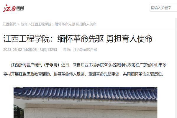 江西新闻客户端讯(于永清)近日,来自江西工程学院30余名教师代表前往广东省中山市翠亨村开展红色思政教育活动,踏寻革命伟人足迹,重温革命先辈事迹,共同缅怀革命先驱历史。
