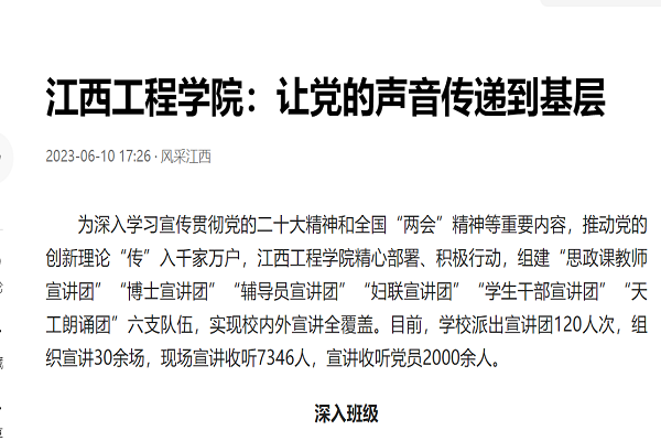 为深入学习宣传贯彻党的二十大精神和全国“两会”精神等重要内容,推动党的创新理论“传”入千家万户,江西工程学院精心部署、积极行动,组建“思政课教师宣讲团”“博士宣讲团”“辅导员宣讲团”“妇联宣讲团”“学生干部宣讲团”“天工朗诵团”六支队伍,实现校内外宣讲全覆盖。目前,学校派出宣讲团120人次,组织宣讲30余场,现场宣讲收听7346人,宣讲收听党员2000余人。
