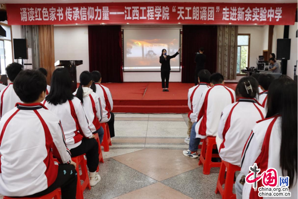 江西工程学院“天工朗诵团”走进新余市实验中学、新余市新兴产业工程学校等诵读红色家书。一封封家书,句句感人,字字滚烫。舞台上,朗诵团成员自信大方,挥洒自如,他们深情的诵读与激情的演绎带领大家回到了那个烽火硝烟、坎坷动荡的革命战争年代,让同学们深刻感受到穿越时空的信仰力量。同学们纷纷表示:“起初以为是场讲座,没想到是场既接地气又感人肺腑的精彩演出。把革命故事以艺术表演方式呈现,水平高、内容精要,不仅是视觉盛宴,情感得到渲染,心灵受到震撼,思想又获一次洗礼。让我们对信仰、革命、真理、奋斗的理解更进了一步。”