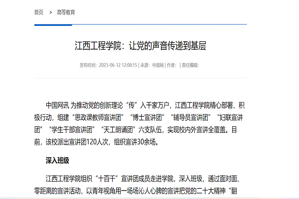 中国网讯 为推动党的创新理论“传”入千家万户,江西工程学院精心部署、积极行动,组建“思政课教师宣讲团”“博士宣讲团”“辅导员宣讲团”“妇联宣讲团”“学生干部宣讲团”“天工朗诵团”六支队伍,实现校内外宣讲全覆盖。目前,该校派出宣讲团120人次,组织宣讲30余场。