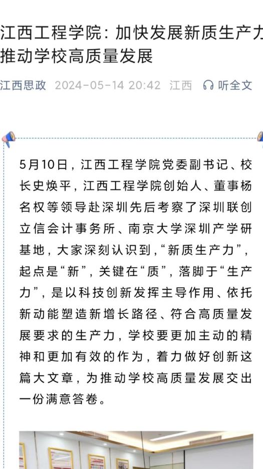 5月10日,江西工程学院党委副书记、校长史焕平,江西工程学院创始人、董事杨名权等领导赴深圳先后考察了深圳联创立信会计事务所、南京大学深圳产学研基地,大家深刻认识到,“新质生产力”,起点是“新”,关键在“质”,落脚于“生产力”,是以科技创新发挥主导作用、依托新动能塑造新增长路径、符合高质量发展要求的生产力,学校要更加主动的精神和更加有效的作为,着力做好创新这篇大文章,为推动学校高质量发展交出一份满意答卷。