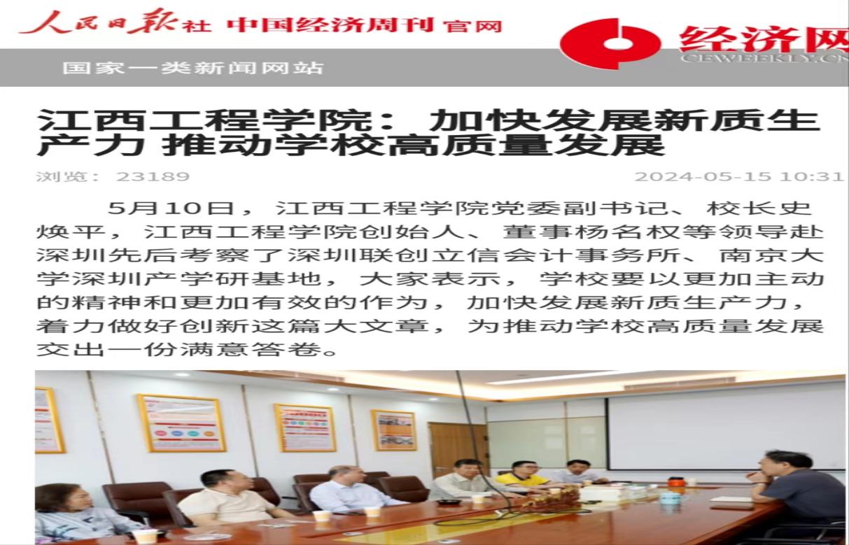 5月10日,江西工程学院党委副书记、校长史焕平,江西工程学院创始人、董事杨名权等领导赴深圳先后考察了深圳联创立信会计事务所、南京大学深圳产学研基地,大家深刻认识到,“新质生产力”,起点是“新”,关键在“质”,落脚于“生产力”,是以科技创新发挥主导作用、依托新动能塑造新增长路径、符合高质量发展要求的生产力,学校要更加主动的精神和更加有效的作为,着力做好创新这篇大文章,为推动学校高质量发展交出一份满意答卷。