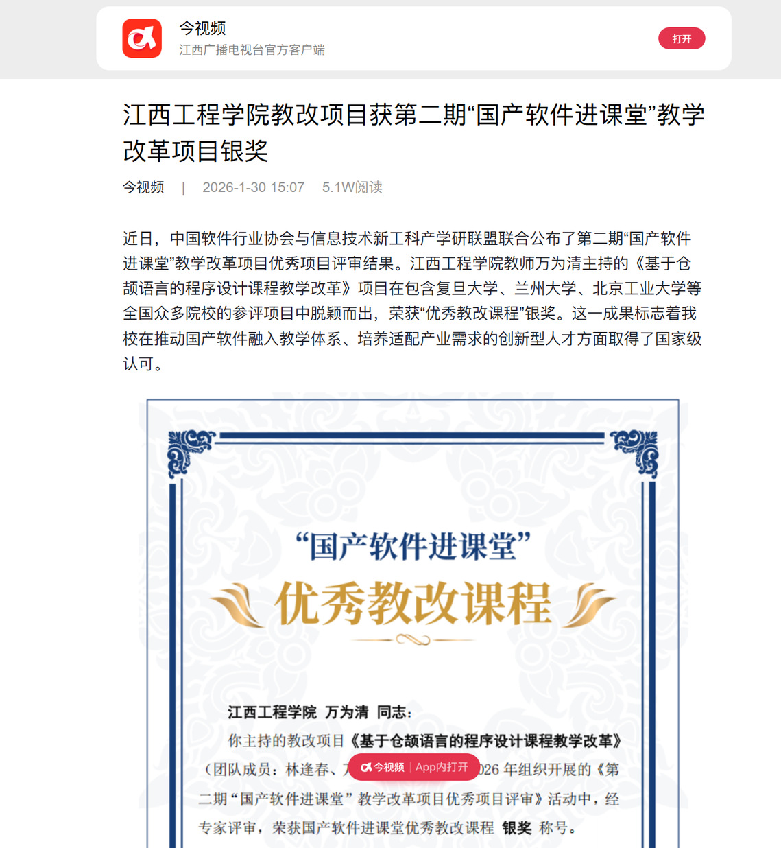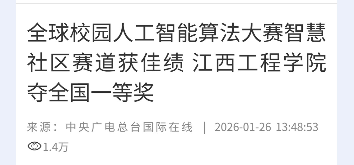 笃行不怠砺初心逐梦韶华终可期—— 江工优秀学子徐阳阳的逐梦之路江工弦歌未歇,四秩薪火正燃。值此江西工程学院建校42周年、迈向平安健康有序新征程之际,为弘扬榜样力量、凝聚奋进共识,学校特别推出“优秀校友特辑”系列报道。本期,让我们走近一位从江西工程学院智慧产业学院走出、以399分高分圆梦“双一流”高校的优秀学子——徐阳阳。人物介绍:徐阳阳,男,江西工程学院智慧产业学院2020级软件工程本科4班学生,2024年以初试399分的优异成绩被吉林大学软件工程专业(085405)录取为硕士研究生。在校期间,他勤学笃行、锐意进取,屡获国家级、省级竞赛大奖,并荣获国家奖学金等多项荣誉,是江工学子中当之无愧的榜样代表。青春逐梦:在代码与算法中淬炼成长2020年秋,徐阳阳怀揣对计算机科学的热爱走进江西工程学院,开启了他的大学征程。从入学第一天起,他就立下目标:“不仅要学好知识,更要练就真本领。”在校期间,他始终秉持“砥砺前行不敢怠”的信念,将大量时间投入到算法训练、项目开发与学科竞赛中。得益于学校浓厚的竞赛文化与智慧产业学院良好的学习氛围,他在蓝桥杯等高水平赛事中屡创佳绩:2023年6月,斩获第十四届蓝桥
