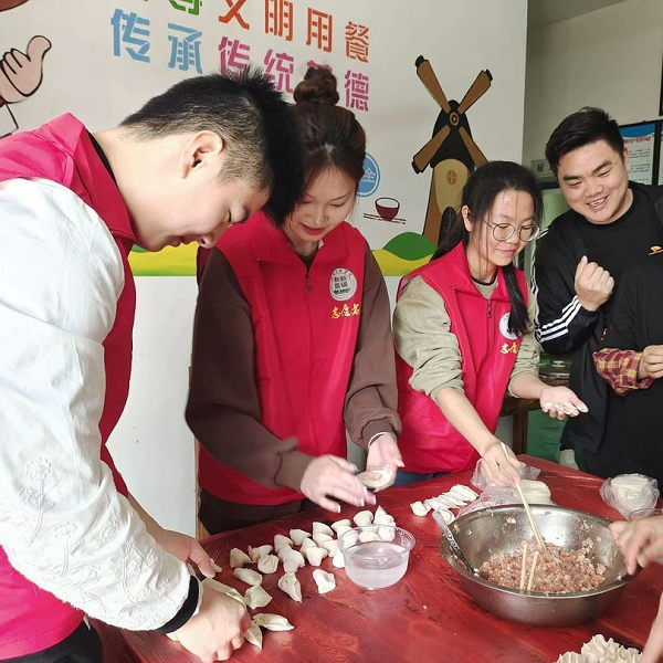 包饺子是中华民族的传统美德,在中国人的习俗里每逢重要的节气或者日子都少不了饺子的身影,自然在这么重要的时刻志愿者们也包起了饺子,形如元宝和小船的饺子在志愿者的手中诞生,志愿者们在餐前共颂感恩词,和孩子老人们一起享用美食。