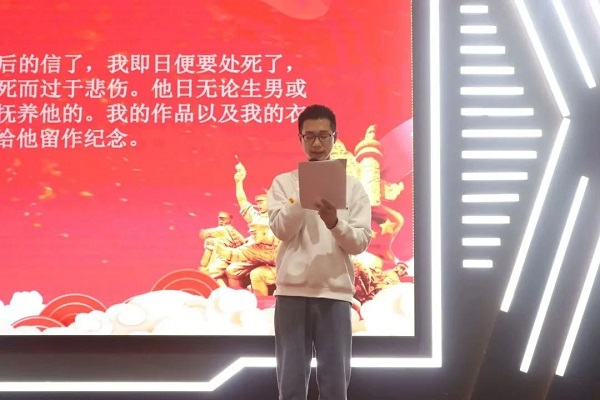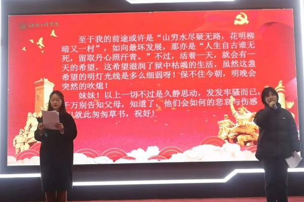 “时传尺素,以寄相思。纸短情长,见字如面。”学校天工朗诵团负责人桂盈盈介绍说,我们要引导青年学生更加珍惜今天的幸福生活,继承革命先烈忠诚如铁的精神、恪尽职守的品格,不忘初心、牢记使命,以实际行动践行心中信仰,将革命精神传承下去。