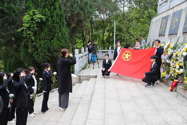革命烈士纪念碑巍然耸立,现场气氛庄严肃穆。全体成员面向革命烈士纪念碑列队肃立,在庄严肃穆的氛围中,敬献花篮,向为新中国英勇捐躯的革命先烈默哀,在纪念碑前高擎右手重温入团誓词,缅怀革命烈士,激发奋进力量。