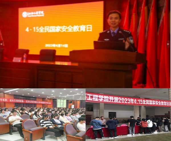 4月14日下午,学校邀请了天工路和北湖路派出所的领导和民警到我校,组织300多名大学生,在学术报告厅联合开展了国家安全教育主题讲座,刘云兵警官围绕深入贯彻落实总体国家安全观、国家安全相关知识、现阶段面临的主要安全风险、公民应履行的维护国家安全义务、邪教的危害和预防邪教渗透等进行详细讲解。会议结束后,开展了“江西工程学院4.15国家安全教育日宣传教育咨询活动”,现场散发国家安全知识宣传资料500余份。