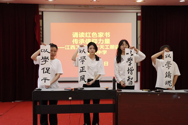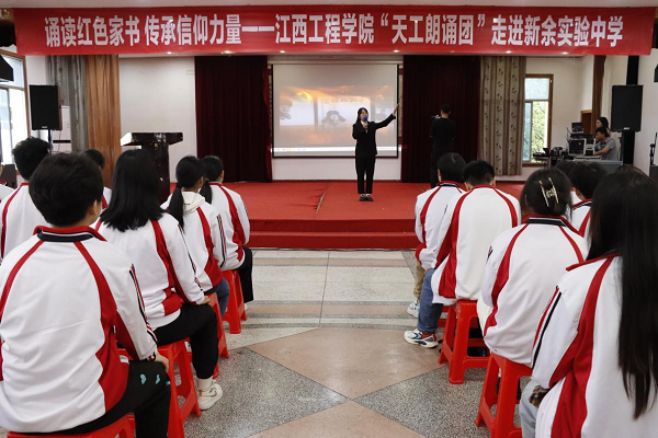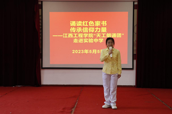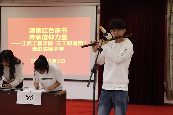 (本网讯 谢旻旻 报道)“这些表演者的朗诵富有激情,一句句铮铮誓言、一声声真情呼唤再现了革命先烈那炮火连天、艰苦奋斗的岁月,真可谓栩栩如生......”5月5日,我校“天工朗诵团”走进新余市实验中学,以书信朗诵、书法、民乐表演等多种表现形式传颂红色家书,表演现场赢得了众多师生高度赞扬。