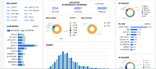 据统计,本次线上招聘会开放时间从4月24日至4月30日,持续一周,共计814家企业参与招聘,发布4051个职位,36880个岗位,涵盖了互联网、机械制造、电子信息、企业管理、房屋建筑、电子商务等多个行业。有662名学生参加线上招聘,一共投递1997份简历,有393名同学与企业达成初步就业意向,为促进2023届毕业生高质量充分就业提供了坚实保障。