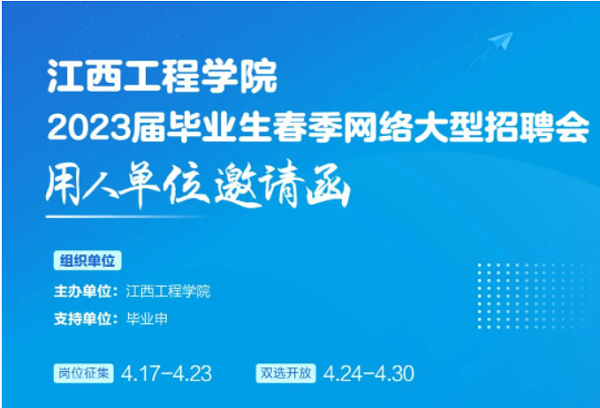 为深入学习贯彻党的二十大精神,落实党中央、国务院“稳就业”“保就业”决策部署,为毕业生和用人单位搭建双向选择的平台,促进毕业生实现更加充分和更高质量的就业,我校就业处组织举办江西工程学院2023届毕业生春季网络大型招聘会。