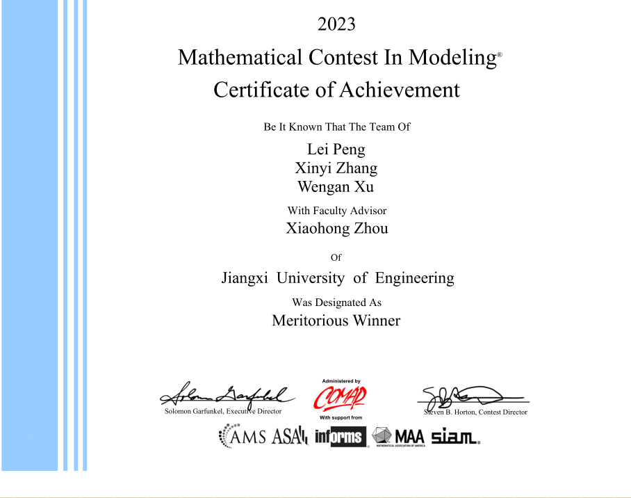 近日,2023年美国大学生数学建模竞赛成绩公布,我校彭磊(会计金融学院)、张欣怡(工商管理学院)、许文淦(电子信息工程学院)三位同学组建的参赛队,荣获赛事的Meritorious Winner(国际一等奖),这是我校自参赛以来首次获此殊荣。美国大学生数学建模竞赛(MCM/ICM)是现今各类数学建模竞赛的鼻祖,也是世界范围内最具影响力的数学建模竞赛。自此,我校实现了已参赛的所有顶级数学建模赛事“一等奖”的大满贯。