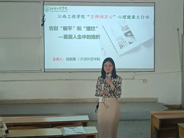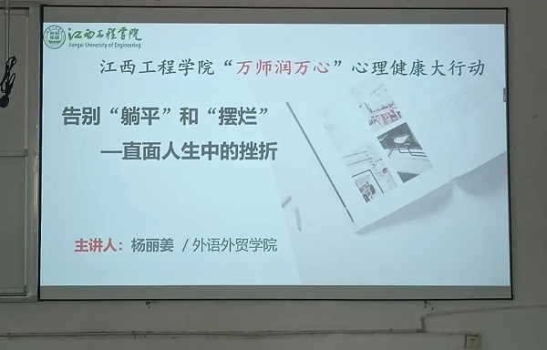 为深入学习贯彻党的二十大精神,提升学生的抗挫折能力,促进学生心理健康发展,培养学生有理想追求、有担当作为、有品德修养的健康心态,帮助学生更好地直面人生当中的困难和挫折,注重学生的心理健康教育,按照学校统一安排部署,5月8日下午,外语外贸学院在D栋106教室开展“告别‘躺平’和‘摆烂’——直面人生中的挫折”心理健康讲座,讲座邀请校“万师润万心”心理健康教育大行动讲师团杨丽姜教授主讲,外语外贸学院全体学生参加此次讲座活动。