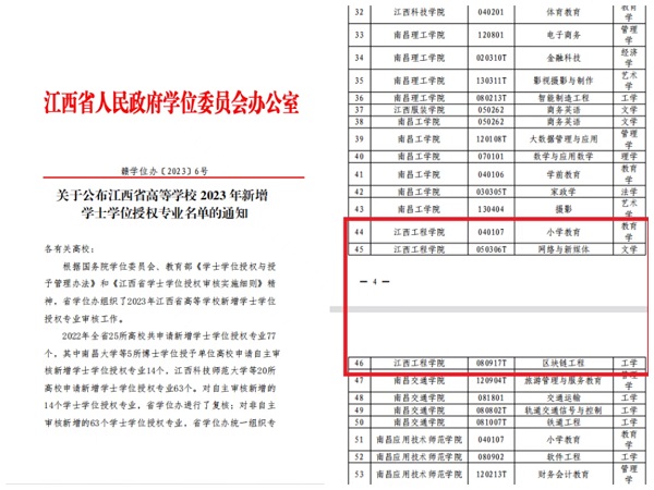 近日,江西省人民政府学位委员会印发了《关于公布江西省高等学校 2023 年新增学士学位授权专业名单的通知》(赣学位办〔2023〕6号)。江西工程学院“小学教育、网络与新媒体、区块链工程”三个本科专业顺利获得学士学位授予权。