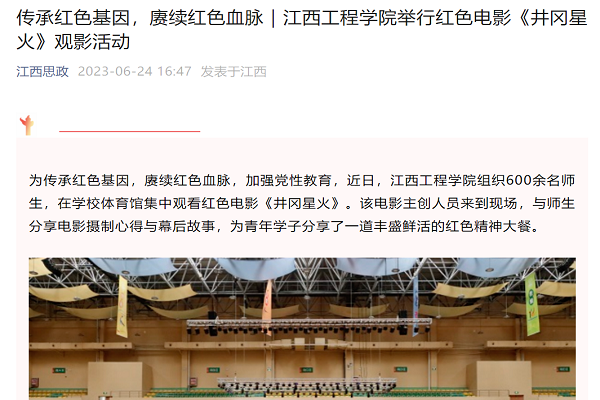 为传承红色基因,赓续红色血脉,加强党性教育,近日,江西工程学院组织600余名师生,在学校体育馆集中观看红色电影《井冈星火》。该电影主创人员来到现场,与师生分享电影摄制心得与幕后故事,为青年学子分享了一道丰盛鲜活的红色精神大餐。