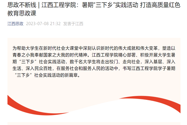 为帮助大学生在新时代社会大课堂中深刻认识新时代的伟大成就和伟大变革,塑造以青春之小我奉献国家之大我的时代精神。江西工程学院精心部署、积极开展大学生暑期“三下乡”社会实践活动,数千名大学生将走出校门、走向社会,深入基层、深入生活、深入民众百姓,在服务社会和服务人民的活动中,书写江西工程学院学子暑期“三下乡”社会实践活动的新篇章。