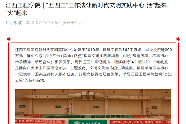 江西工程学院新时代文明实践中心始建于2019年,建筑面积为562平方米,学校投资近200万元,该中心以“多维平台+阵地+队伍”构建文明实践新场景,内设“辉煌历程、不忘初心;传承精神、感恩奋斗;旗帜引领、筑梦江工;牢记嘱托、砥砺前行”4个板块和1个电教室,是面向广大师生开展理论宣讲、主题教育、文明文化宣传的生动课堂,更是学校不忘初心、牢记使命,落实立德树人根本任务,打造高校党建红色引擎,书写江西工程学院教育“奋进之笔”的精神高地。