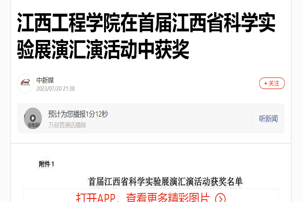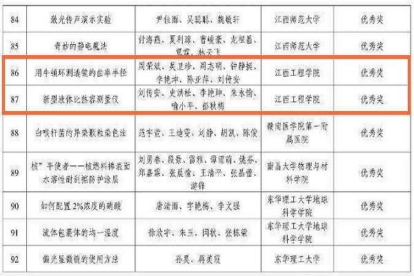 在首届江西省科学实验展演汇演活动中获得两项优秀奖。其中,由周荣斌、吴卫珍、周志明、钟静挺、李艳坤、陈亚萍、刘传安为主创人员的作品《用牛顿环测透镜的曲率半径》和以刘传安、史洪松、李艳坤、朱永愉、喻小平、彭秋梅为主创人员的作品《新型液体比热容测量仪》获此次活动优秀奖。
