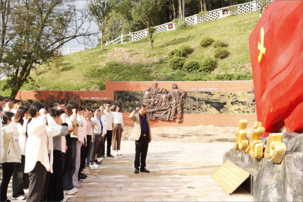 活动伊始,全体党员站在九龙山革命斗争陈列馆前的广场上,面对鲜红的党旗,在党委副书记、校长陈学军同志的带领下全体党员师生重温了入党誓词。