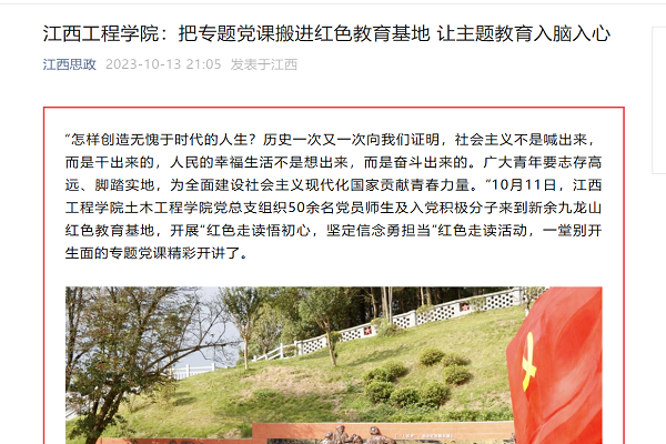 “怎样创造无愧于时代的人生?历史一次又一次向我们证明,社会主义不是喊出来,而是干出来的,人民的幸福生活不是想出来,而是奋斗出来的。广大青年要志存高远、脚踏实地,为全面建设社会主义现代化国家贡献青春力量。”10月11日,江西工程学院土木工程学院党总支组织50余名党员师生及入党积极分子来到新余九龙山红色教育基地,开展“红色走读悟初心,坚定信念勇担当”红色走读活动,一堂别开生面的专题党课精彩开讲了。