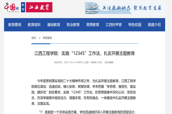 今年是贯彻落实党的二十大精神开局之年,为扎实开展主题教育,江西工程学院高位谋划、迅速启动,精心安排、统筹协调,牢牢把握“学思想、强党性、重实践、建新功”的总要求,实施“12345”工作法,在思想碰撞中深化认识、坚定信念,在深学细悟中激发动力、增强本领,在有机融合、一体推进中扎实开展主题教育,注重实效。