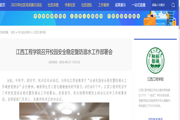 当前,中秋节、国庆节、杭州亚运会临近,为传达江西省教育厅“全省校园安全稳定暨防溺水工作调度视频会”会议精神,确保师生员工度过健康愉快的节假日。9月19日下午,江西工程学院召开了学校校园安全稳定暨防溺水工作部署会,党委委员、校长助理邹建民主持会议并作工作部署讲话,各职能部门负责人、各教学院书记参加会议。
