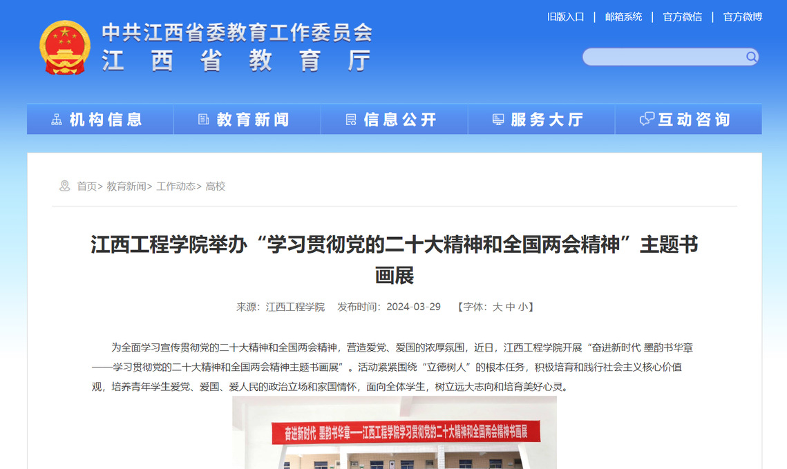 为全面学习宣传贯彻党的二十大精神和全国“两会”精神,营造爱党、爱国的浓厚氛围,近日,江西工程学院开展“奋进新时代墨韵书华章——学习贯彻党的二十大精神”和“两会精神主题书画展”。活动紧紧围绕“立德树人”的根本任务,积极培育和践行社会主义核心价值观,培养青年学生爱党、爱国、爱人民的政治立场和家国情怀,面向全体学生,树立远大志向和培育美好心灵。