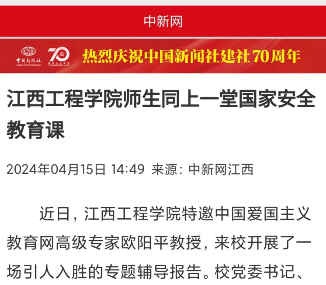 近日,江西工程学院特邀中国爱国主义教育网高级专家欧阳平教授,来校开展了一场引人入胜的专题辅导报告。校党委书记、督导专员胡涌主持讲座,全校教职工、学生共7000余人通过线上线下收听收看。