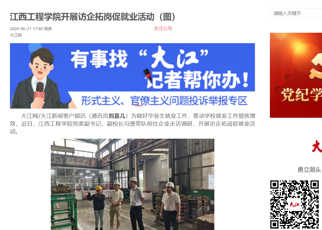 大江网/大江新闻客户端讯(通讯员刘喜儿)为做好毕业生就业工作,推动学校就业工作提质增效,近日,江西工程学院党委副书记、副校长冯赟带队前往企业走访调研,开展访企拓岗促就业活动。