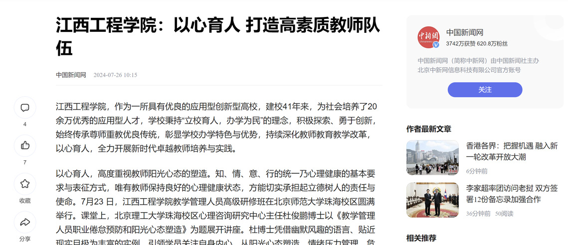 江西工程学院正以坚定的步伐,致力于打造一支高素质的教师队伍,为推动学校的高质量发展不懈努力,为培养更多优秀人才贡献力量。正如江西工程学院骨干教师黄敏所说,“在教育这一神圣而复杂的领域中,教师的心态如同明镜,需时常拂拭,以保持其清澈与纯净,方能照亮学生的心灵之路。教育者的初心,往往源自于对知识的热爱、对学生的关怀以及对教育事业的执着。‘经常洗心’意味着时常回顾并坚守这份初心,不让繁琐的日常或是偶尔的挫败感侵蚀了内心的热爱与激情。保持对教育的纯粹热爱,是教育事业最宝贵的动力源泉。”