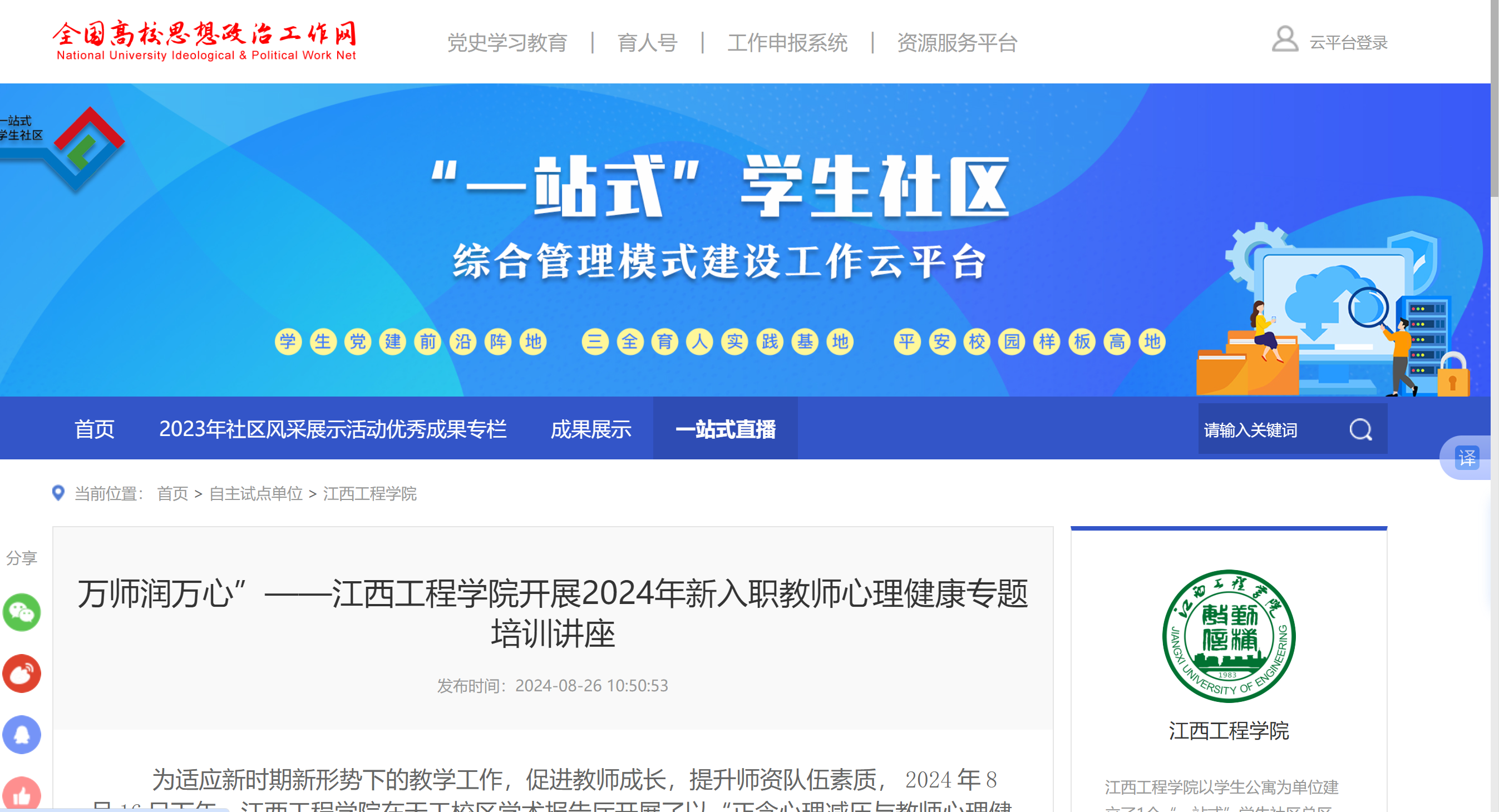 本次讲座是学校人事处组织的新教师培训系列讲座之一,学校已连续多年将心理专题讲座纳入新教师培训体系,每年邀请心理健康教育与咨询中心教师授课。近年来学校心理健康教育与咨询中心联合人事处、校工会、学生工作部、各二级学院等校内各单位部门积极探索协同心理育人实践,新教师心理专题讲座是中心面向不同教职工群体开展心理培训的重要组成部分,更是江西工程学院校内协同心理育人的重要途径之一。