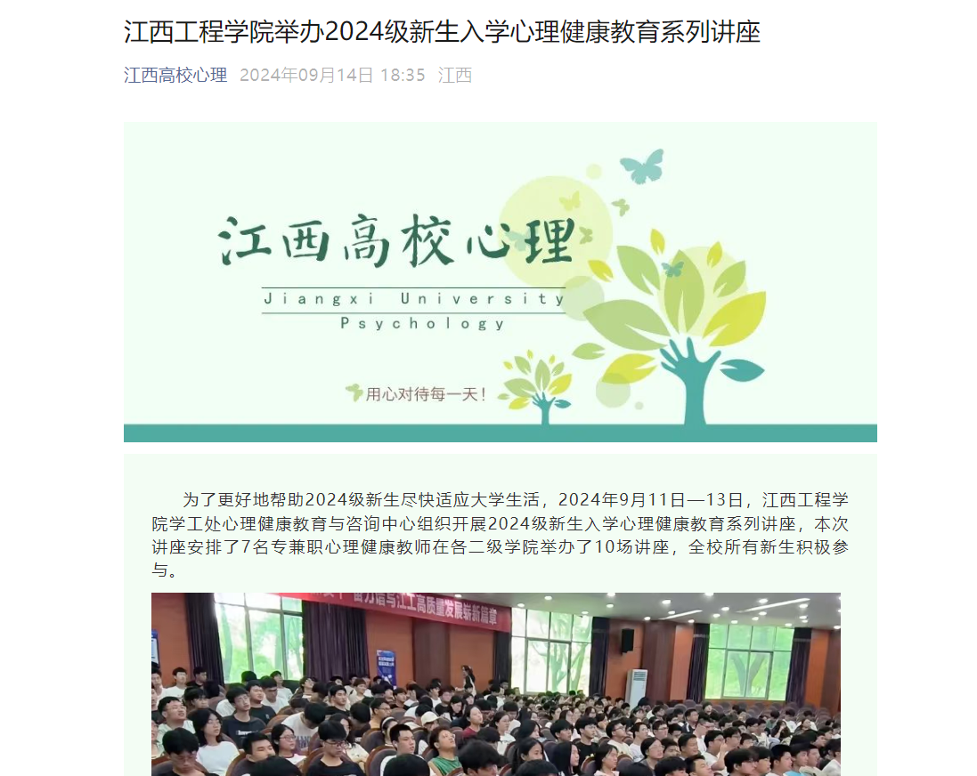 为了更好地帮助2024级新生尽快适应大学生活,2024年9月11日—13日,江西工程学院学工处心理健康教育与咨询中心组织开展2024级新生入学心理健康教育系列讲座,本次讲座安排了7名专兼职心理健康教师在各二级学院举办了10场讲座,全校所有新生积极参与。