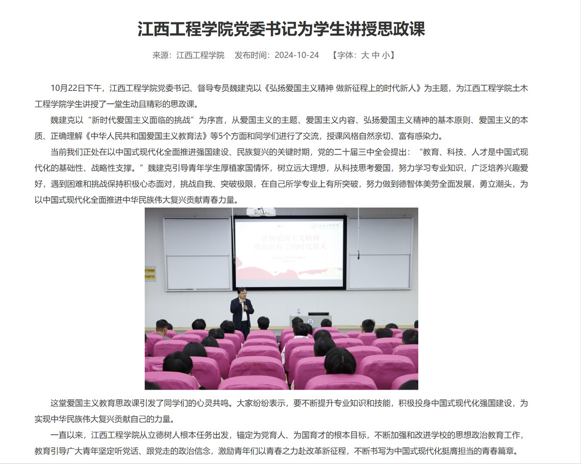 10月22日下午,江西工程学院党委书记、督导专员魏建克以《弘扬爱国主义精神 做新征程上的时代新人》为主题,为江西工程学院土木工程学院学生讲授了一堂生动且精彩的思政课。