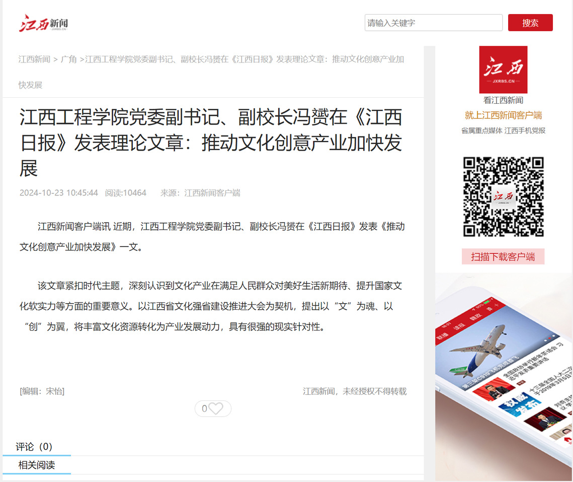 江西新闻客户端讯 近期,江西工程学院党委副书记、副校长冯赟在《江西日报》发表《推动文化创意产业加快发展》一文。