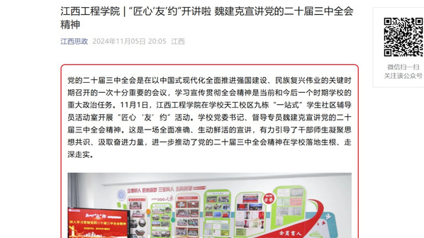 党的二十届三中全会是在以中国式现代化全面推进强国建设、民族复兴伟业的关键时期召开的一次十分重要的会议,学习宣传贯彻全会精神是当前和今后一个时期学校的重大政治任务。11月1日,江西工程学院在学校天工校区九栋“一站式”学生社区辅导员活动室开展“匠心‘友’约”活动。学校党委书记、督导专员魏建克宣讲党的二十届三中全会精神。这是一场全面准确、生动鲜活的宣讲,有力引导了干部师生凝聚思想共识、汲取奋进力量,进一步推动了党的二十届三中全会精神在学校落地生根、走深走实。