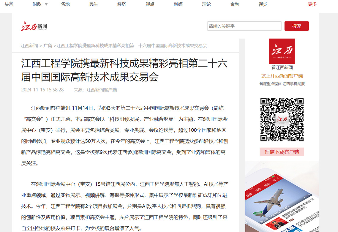 江西新闻客户端讯 11月14日,为期3天的第二十六届中国国际高新技术成果交易会(简称“高交会”)正式开幕。本届高交会以“科技引领发展,产业融合聚变”为主题,在深圳国际会展中心(宝安)举行,展会主要包括综合类展、专业类展、会议论坛等,超过100个国家和地区的团组参加,专业观众预计达50万人次。在今年的高交会上,江西工程学院携众多前沿技术和创新产品惊艳亮相高交会,这是学校第9次代表江西参加深圳国际高交会,受到了业界和媒体的高度关注。
