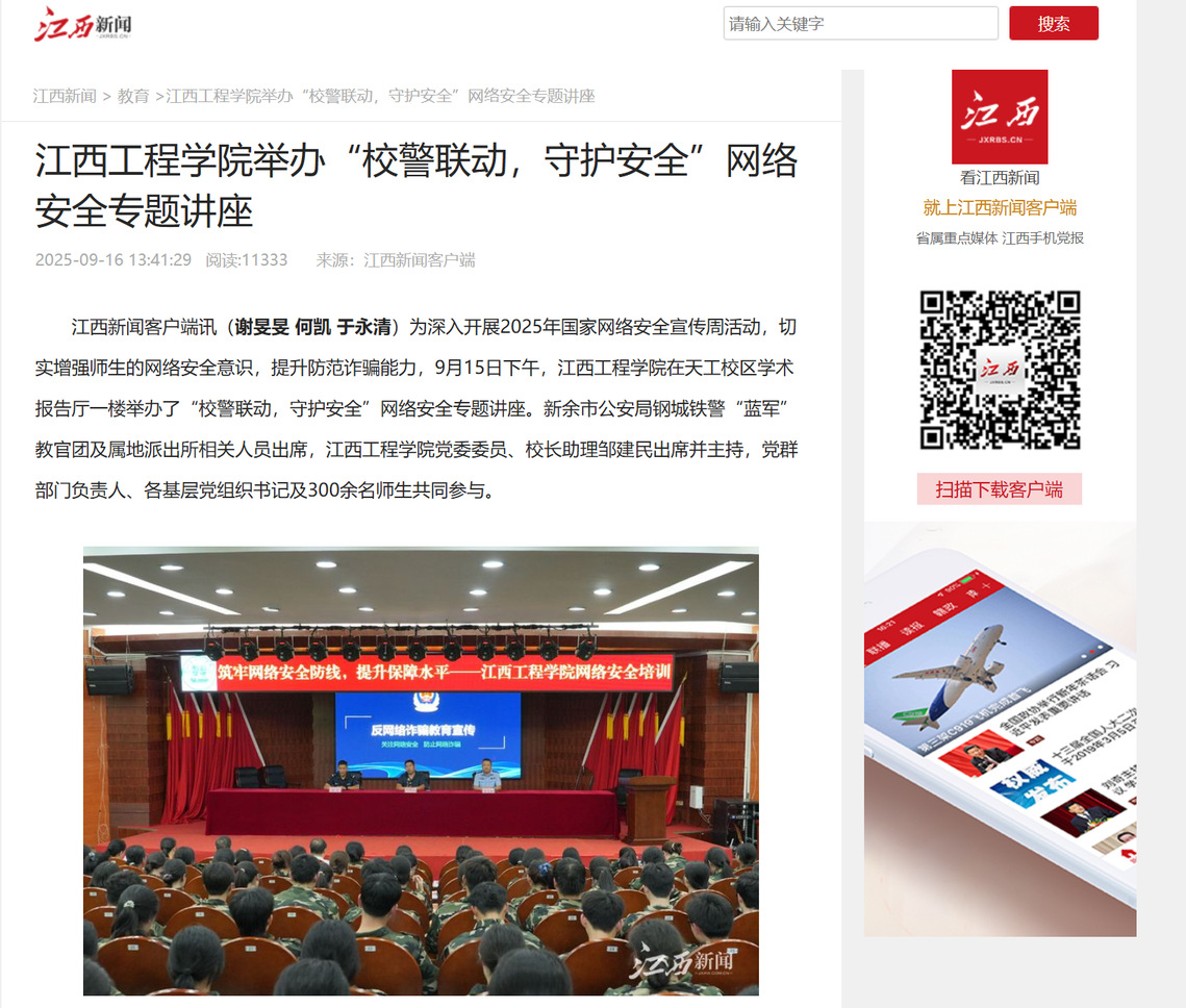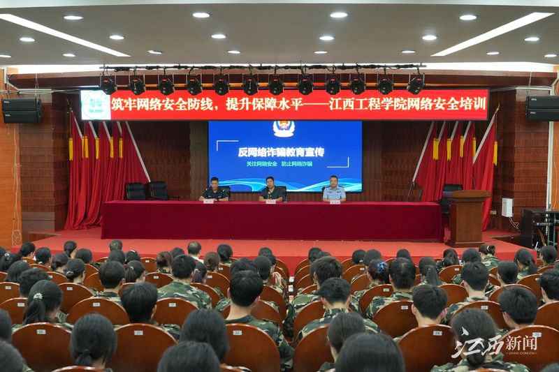 江西新闻客户端讯(谢旻旻 何凯 于永清)为深入开展2025年国家网络安全宣传周活动,切实增强师生的网络安全意识,提升防范诈骗能力,9月15日下午,江西工程学院在天工校区学术报告厅一楼举办了“校警联动,守护安全”网络安全专题讲座。新余市公安局钢城铁警“蓝军”教官团及属地派出所相关人员出席,江西工程学院党委委员、校长助理邹建民出席并主持,党群部门负责人、各基层党组织书记及300余名师生共同参与。
