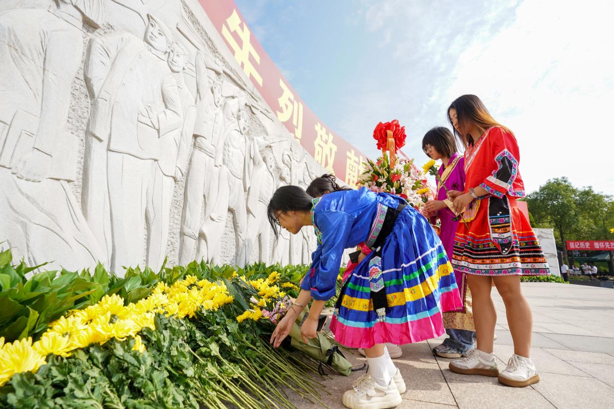 默哀毕,队伍缓缓移动,绕纪念碑而行。目光抚过碑身的刻痕,碑面上投下的细碎光影,仿佛先辈们无声的注视。这份历史的厚重与精神的力量相交织,在心底沉淀出继续前行的信念。献花者手捧素雅花束,在墓前碑旁躬身伫立。花束轻置,空气仿佛静止。以这静默的仪式,让哀思随花香漫过青石板,渗入黄土下的忠魂。每一束花都是一座桥梁,连接起古今,让“不朽”二字,在寂静中愈发清晰。
