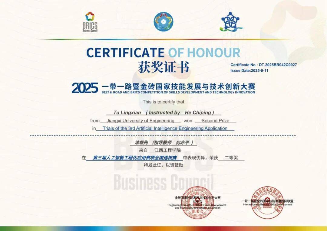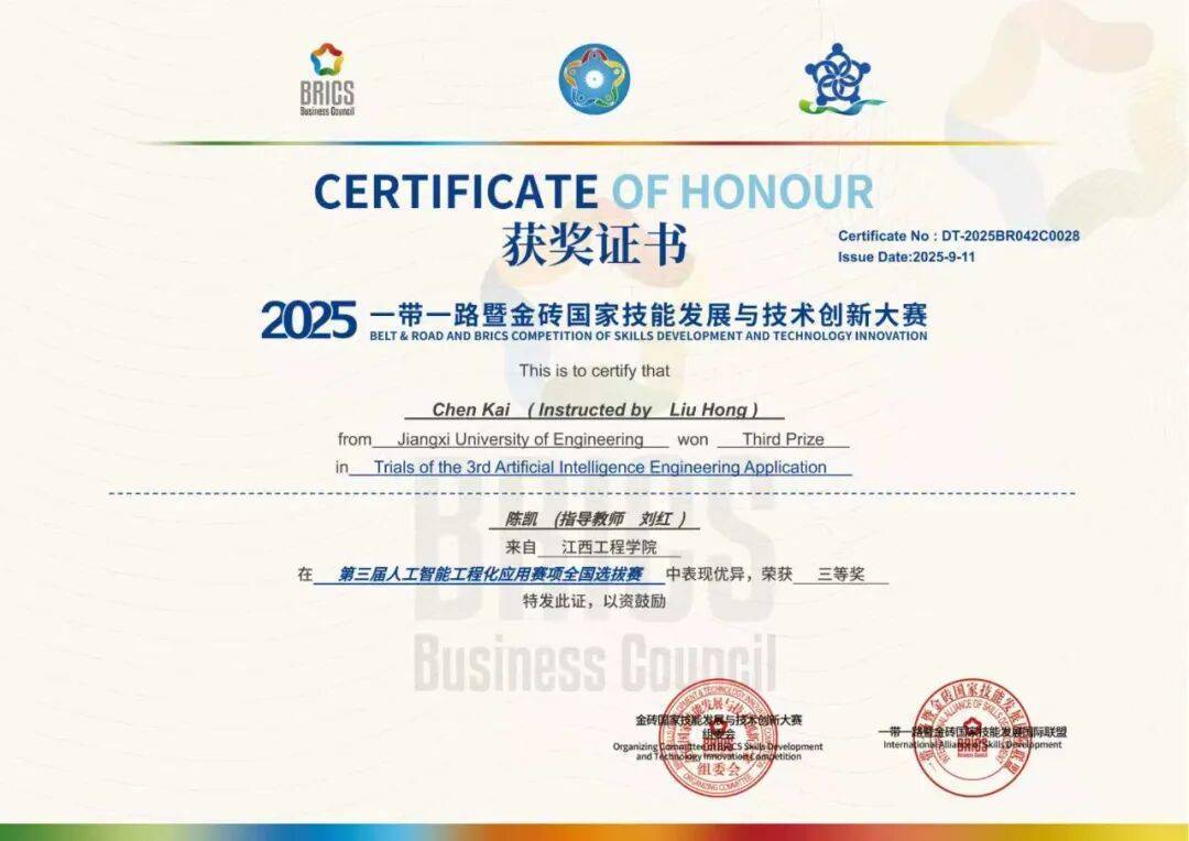 近日,2025“一带一路”暨金砖国家技能发展与技术创新大赛——第三届人工智能工程化应用赛项(工程实践)全国选拔赛中,我校人工智能与数据科学学院派出的两支队伍全员获奖,分别荣获二等奖和三等奖,充分展现了学校在AI工程化人才方面的培养成效。