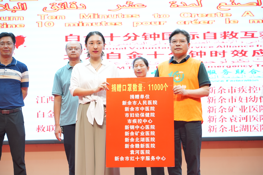 在热烈的掌声中,新余市卫健委医政科科长刘鹏发表讲话并宣布:“健康新余行动暨第十六届‘急救白金十分钟——全国(国际)自救互救日’志愿服务活动正式开始!”仪式还包括了由新余市人民医院向我校进行的口罩捐赠,以及为部分留学生代表颁发志愿服务证书、为2025年度“白金十分钟”优秀集体与个人颁奖等环节。我校学生与市人民医院共同准备的舞蹈节目《白金十分钟》为活动增添了活力与温情。