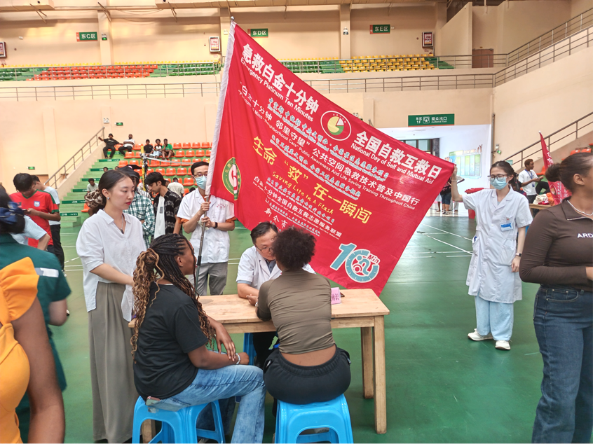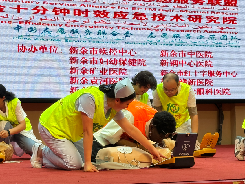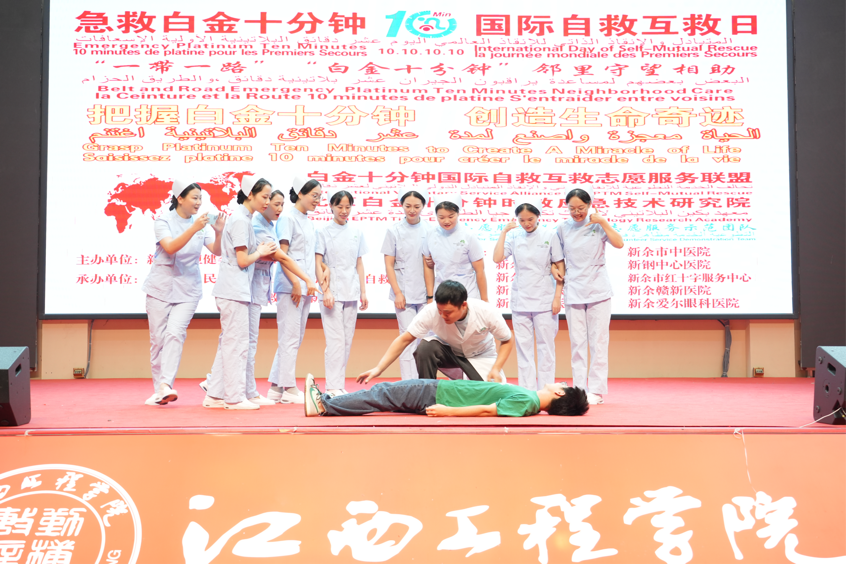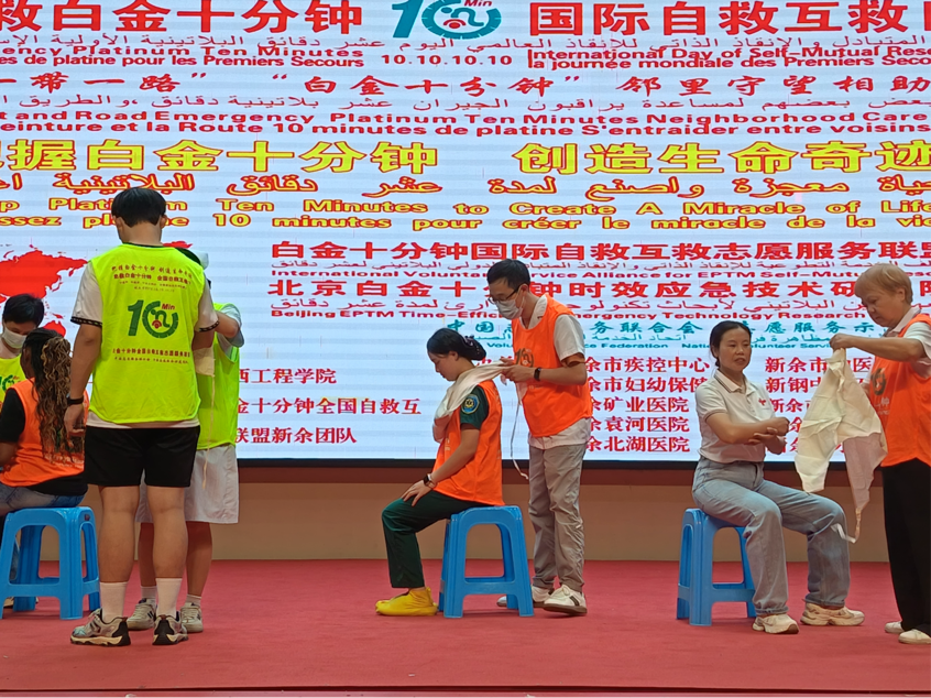 活动的第二大部分“健康新余暨白金十分钟科普活动” 将现场气氛推向高潮。在专业医护人员的主导下,现场分别设置了成人心肺复苏和AED使用、解除气管异物梗阻(海姆立克急救法)、大悬臂带包扎等多个实操演示与体验区。来自新余市人民医院、中医院、红十字服务中心等单位的医护人员同台演示,步骤清晰,讲解专业。演示结束后,我校留学生们被特邀上台,在专家的一对一指导下进行实践操作,亲身学习掌握了多项关键的急救技术。活动现场还同步开展了专家义诊和面向所有参与者的台下技术传授,形成了“人人学急救”的生动场面。