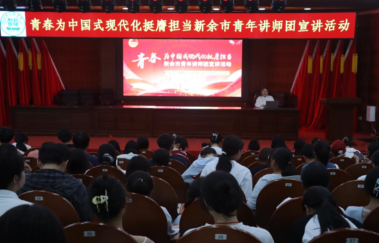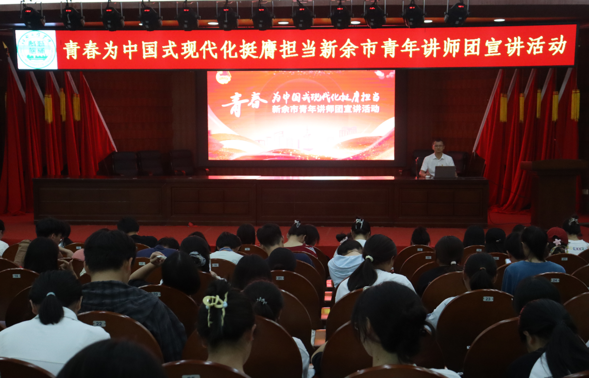 为深入学习贯彻习近平新时代中国特色社会主义思想,深刻领会习近平总书记关于青年工作的重要思想。10月15日,新余市青年讲师宣讲团成员施新华、黄琴在天工校区学术报告厅一楼开展了“青春为中国式现代化挺膺担当”主题宣讲活动,与来自各学院的350名青年学生代表,共赴一场思想与青春的深刻对话。