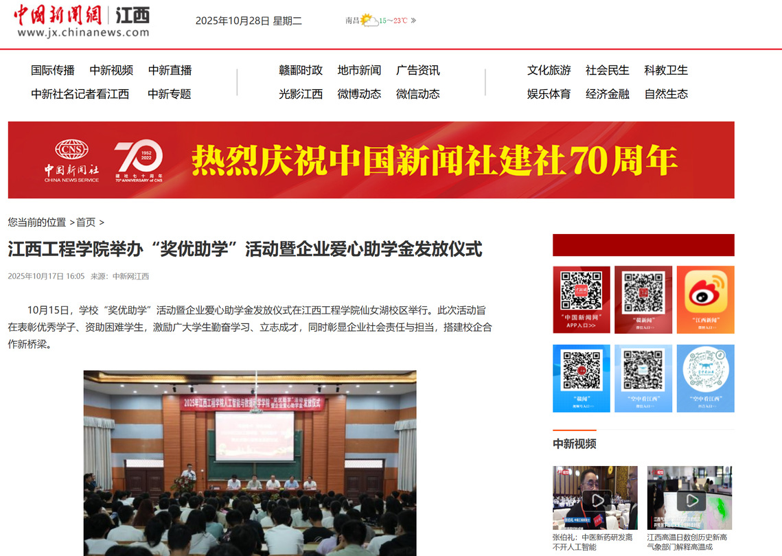 10月15日,学校“奖优助学”活动暨企业爱心助学金发放仪式在江西工程学院仙女湖校区举行。此次活动旨在表彰优秀学子、资助困难学生,激励广大学生勤奋学习、立志成才,同时彰显企业社会责任与担当,搭建校企合作新桥梁。