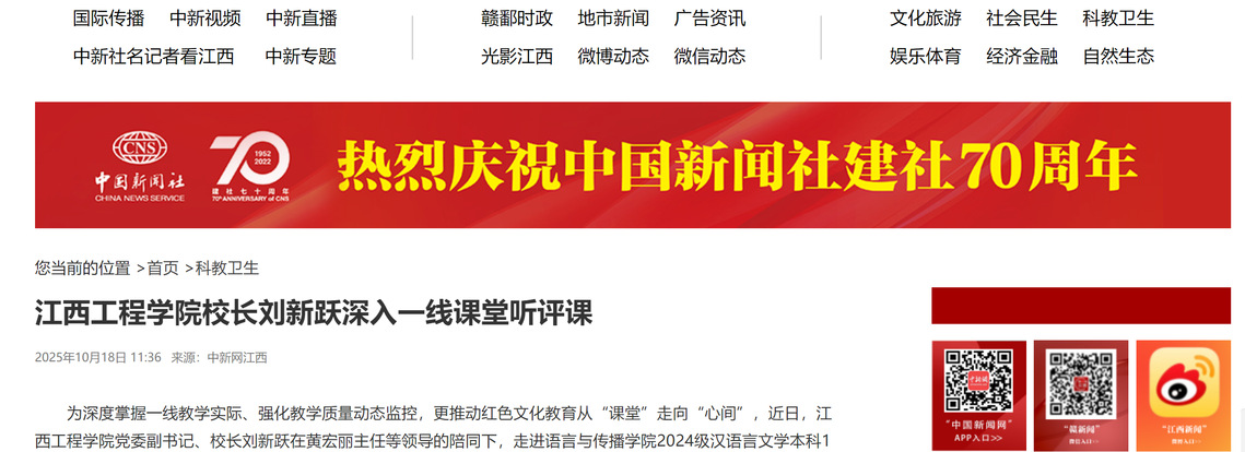 此次刘新跃深入一线听评课,既是对教学工作的精准把脉,也为教师搭建了交流学习、提升教学能力的平台,更彰显了学校以“一线调研”推动教学优化、聚焦红色文化培育时代新人的决心。江西工程学院将以此次听课评课为契机,持续深化教学质量建设,推进《红色文化十讲》等红色课程的内容与形式改革,切实把红色资源转化为育人优势,为培养更多担当民族复兴大任的时代新人筑牢思想根基。(车凤英)