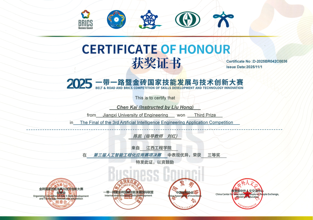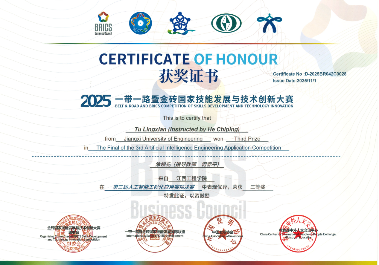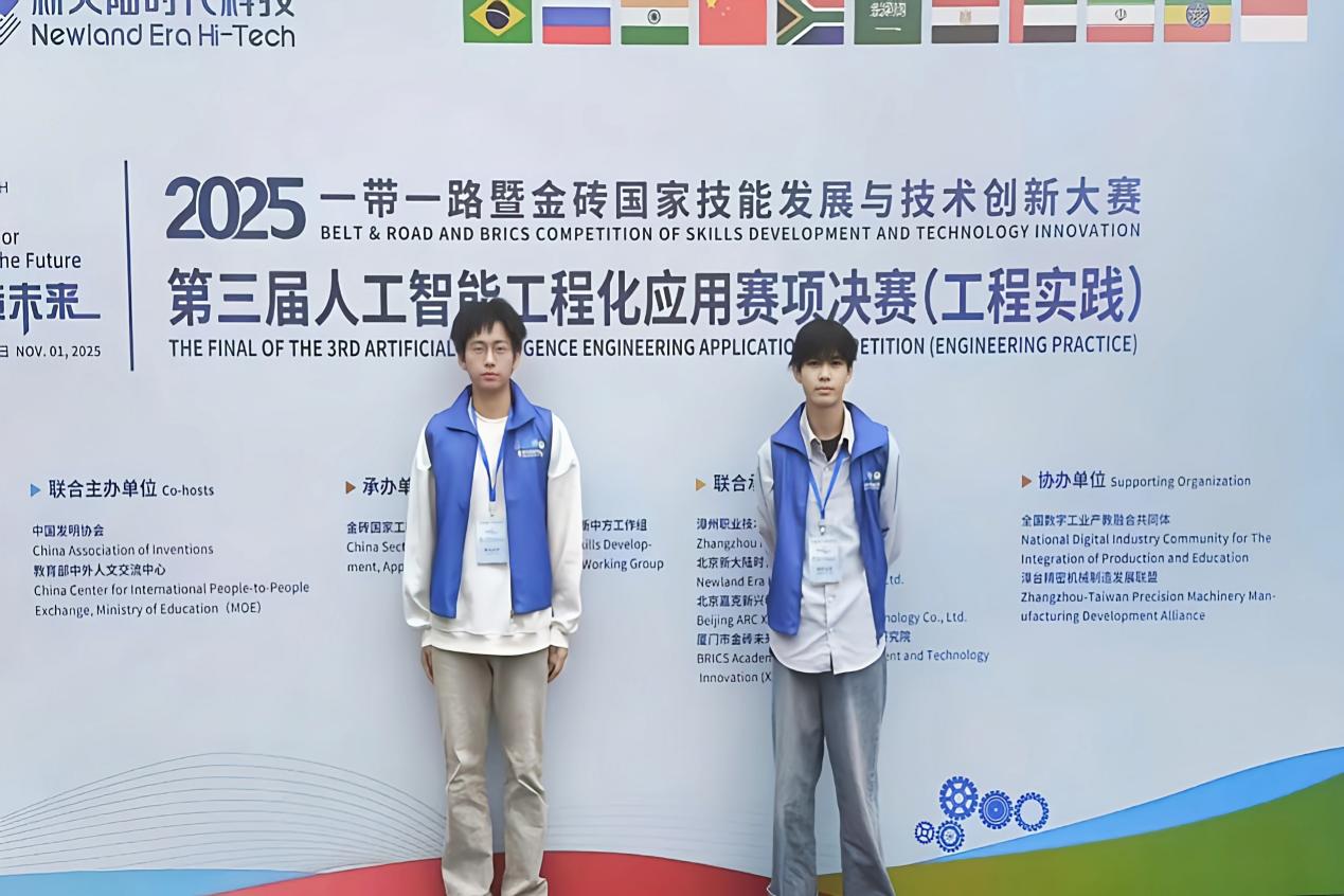 近日,2025年“一带一路”暨金砖国家技能发展与技术创新大赛人工智能工程化应用赛项总决赛在漳州职业技术学院举行,经过4小时的激烈角逐,我校人工智能与数据科学学院的涂领先、陈凯两位同学表现优异,首次参加并双双斩获全国三等奖,充分展现了学校在AI工程化人才培养方面的扎实成效。