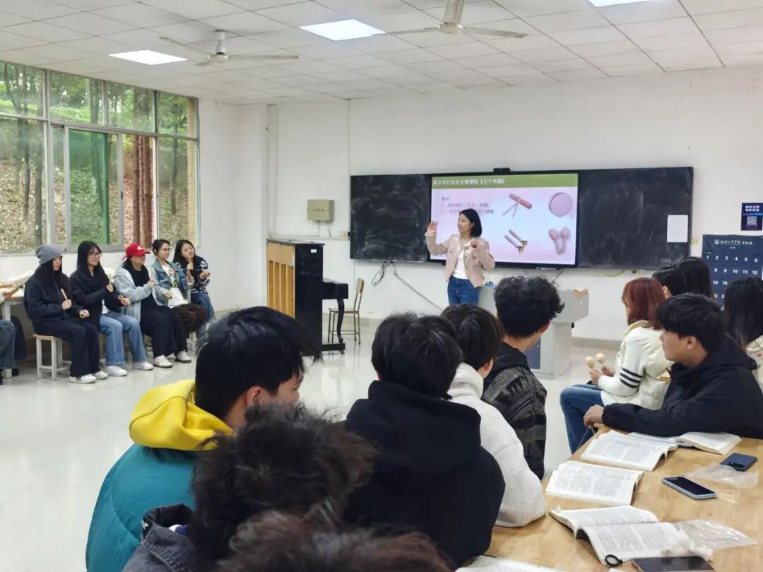 课堂上,何家洁老师以“音乐教育中的跨学科融合”为主题,通过“理论讲授+案例分析+互动实践”三位一体的教学模式,引导学生探讨音乐与文学、舞蹈等艺术形式的融合路径。她以《吉祥三宝》为切入点,结合多媒体视频、现场乐器演示及即兴创作,生动呈现了音乐教育在传承文化、激发创造力中的独特价值。学生们积极参与课堂讨论,围绕“如何将传统音乐元素融入现代教学”等议题展开热烈辩论,课堂气氛活跃。