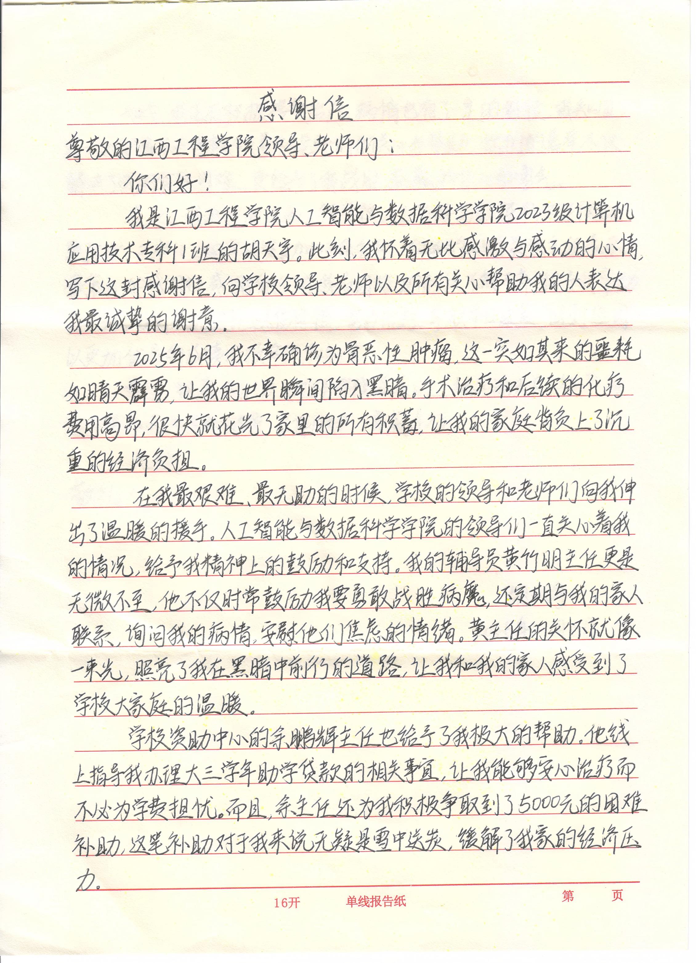 我是江西工程学院人工智能与数据科学学院2023级计算机应用技术专科1班的胡天宇。此刻,我怀着无比感激与感动的心情,写下这封感谢信,向学校领导、老师以及所有关心帮助我的人表达我最诚挚的谢意。