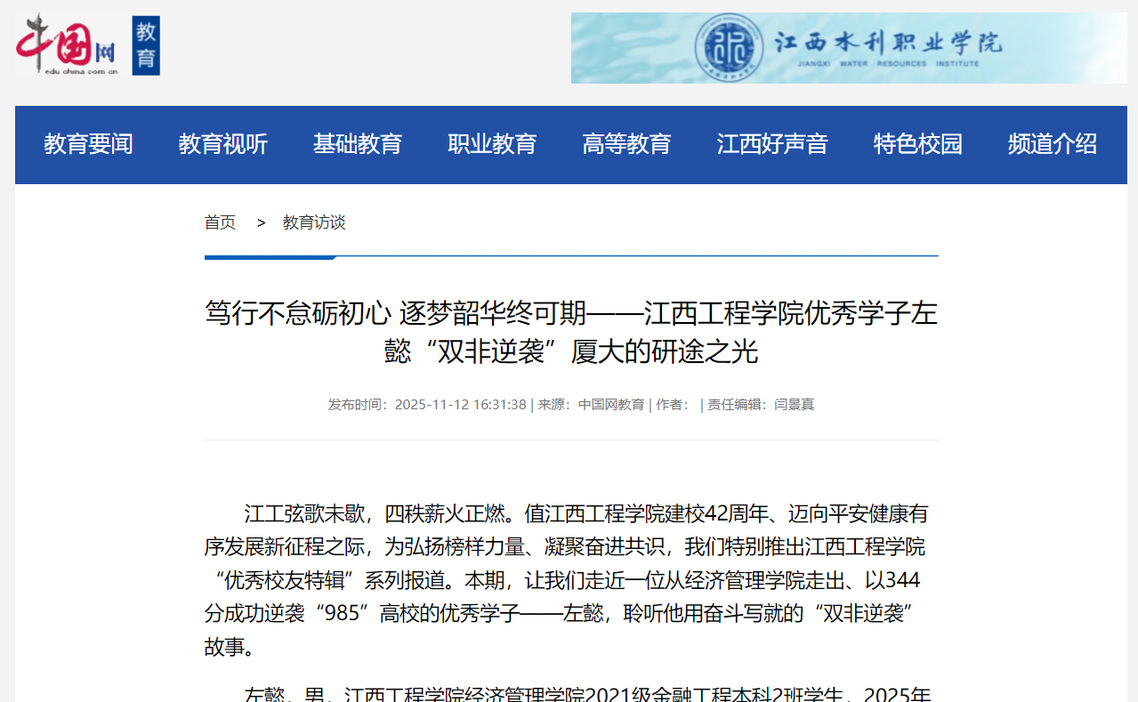 江工弦歌未歇,四秩薪火正燃。值江西工程学院建校42周年、迈向平安健康有序发展新征程之际,为弘扬榜样力量、凝聚奋进共识,我们特别推出江西工程学院“优秀校友特辑”系列报道。本期,让我们走近一位从经济管理学院走出、以344分成功逆袭“985”高校的优秀学子——左懿,聆听他用奋斗写就的“双非逆袭”故事。