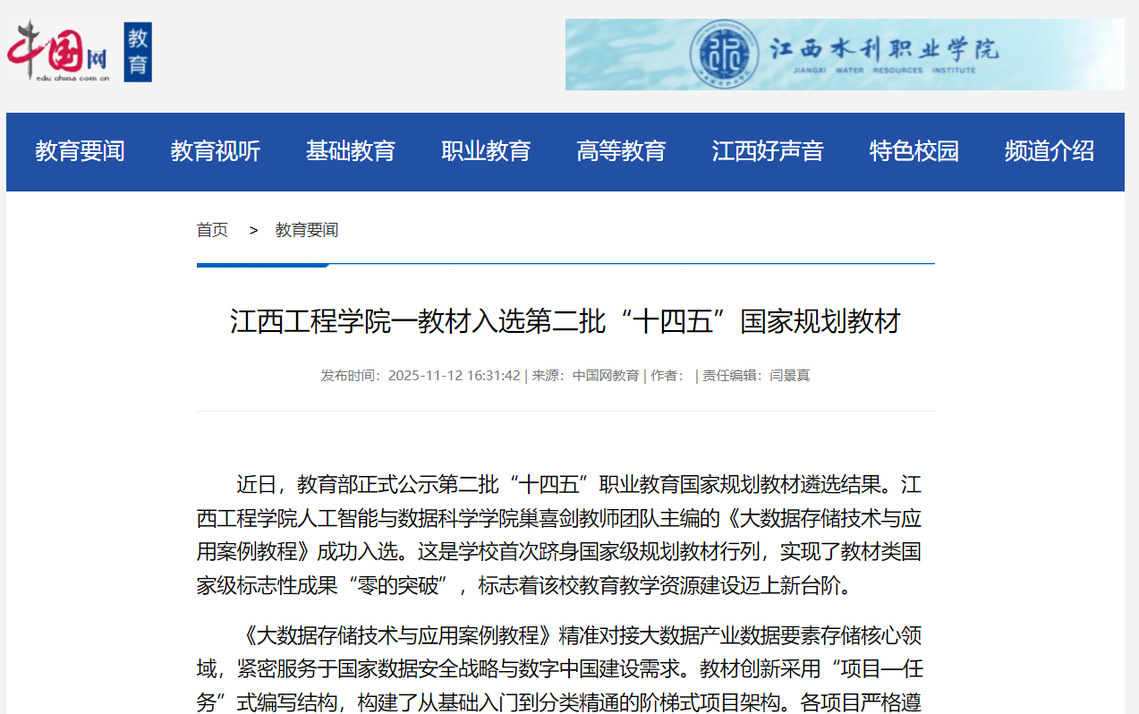 近日,教育部正式公示第二批“十四五”职业教育国家规划教材遴选结果。江西工程学院人工智能与数据科学学院巢喜剑教师团队主编的《大数据存储技术与应用案例教程》成功入选。这是学校首次跻身国家级规划教材行列,实现了教材类国家级标志性成果“零的突破”,标志着该校教育教学资源建设迈上新台阶。