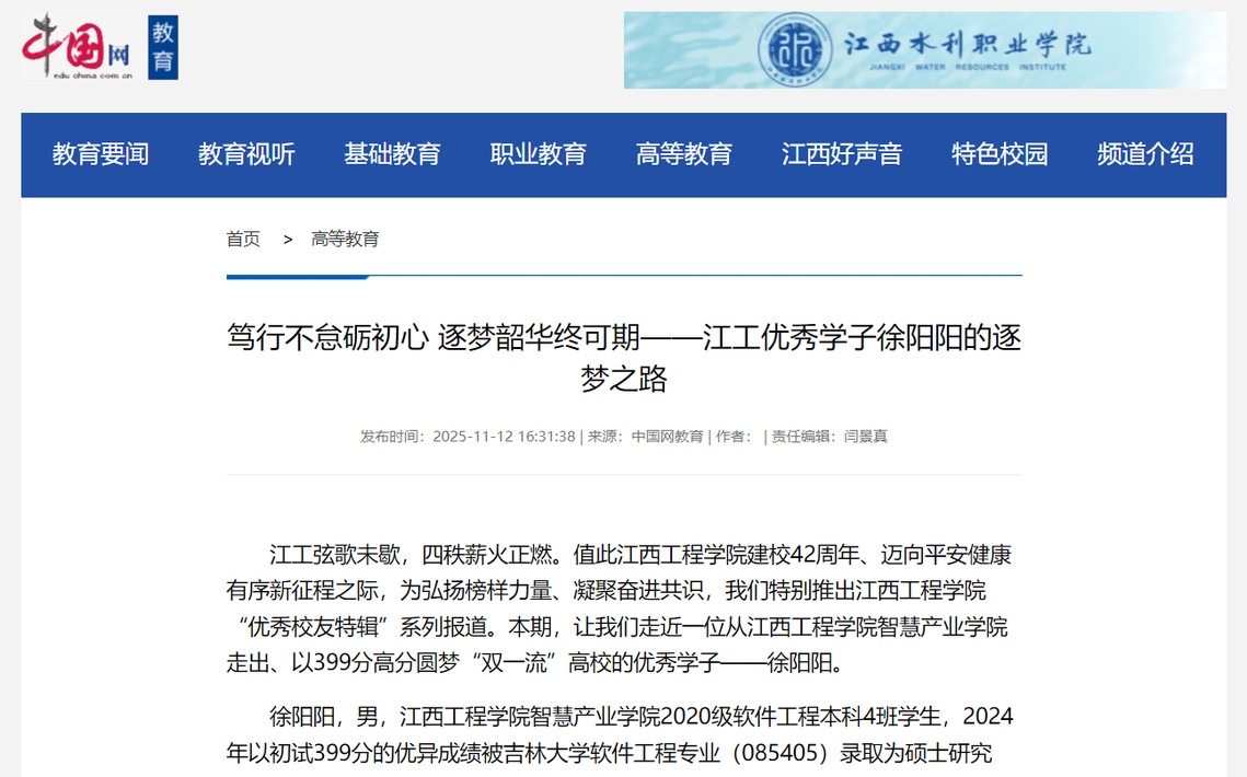 江工弦歌未歇,四秩薪火正燃。值此江西工程学院建校42周年、迈向平安健康有序新征程之际,为弘扬榜样力量、凝聚奋进共识,我们特别推出江西工程学院“优秀校友特辑”系列报道。本期,让我们走近一位从江西工程学院智慧产业学院走出、以399分高分圆梦“双一流”高校的优秀学子——徐阳阳。